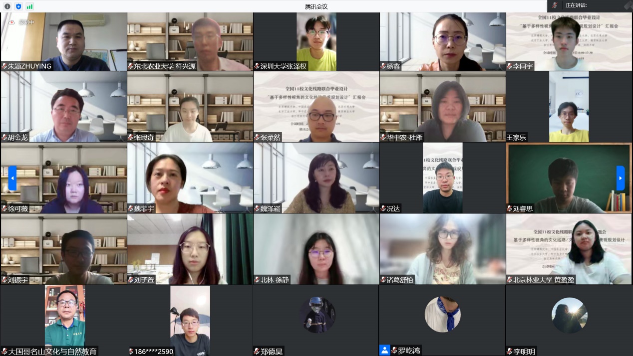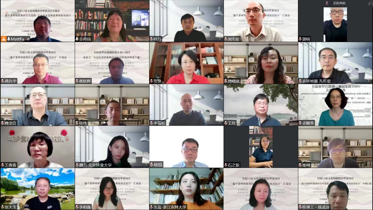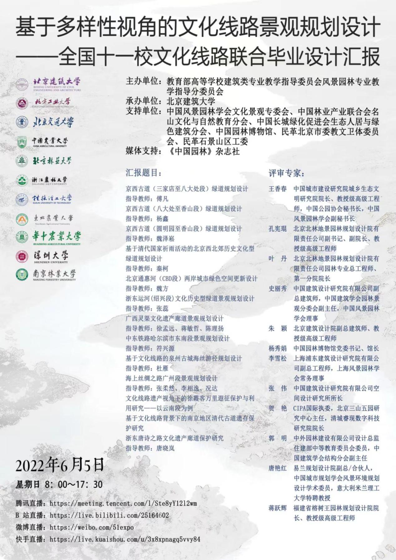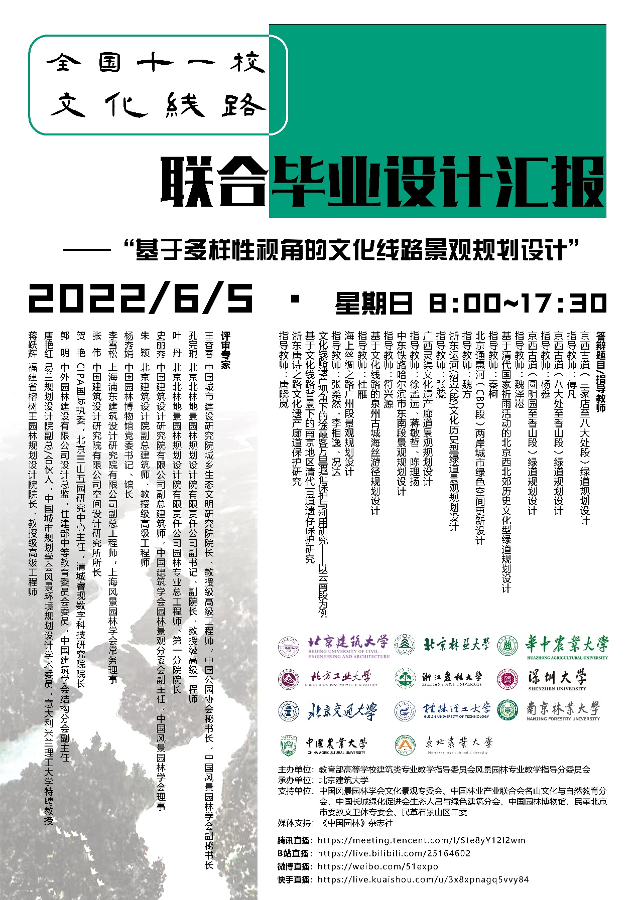 2022年6月5日,由教育部高等学校建筑类专业教学指导委员会风景园林专业教学指导分委员会主办,永利官网承办,永利官网、中国农业大学、北京林业大学、北京交通大学、北方工业大学、华中农业大学、桂林理工大学、南京林业大学、浙江农林大学、东北农业大学、深圳大学等11所高校参加的“基于多样性视角的文化线路景观规划设计——全国11校文化线路联合毕业设计“汇报会顺利举行,来自全国11所高校的师生与会议嘉宾、评委92人相聚云端,通过腾讯会议参加了汇报会,近80万人次通过B站、微博、快手、视频号等平台观看了汇报。本次活动得到了中国风景园林学会文化景观专委会、中国林业产业联合会名山文化与自然教育分会、中国长城绿化促进会生态人居与绿色建筑分会、中国园林博物馆、民革北京市委教文卫体专委会、民革石景山区工委等单位的支持,并由《中国园林》杂志社作为媒体支持。